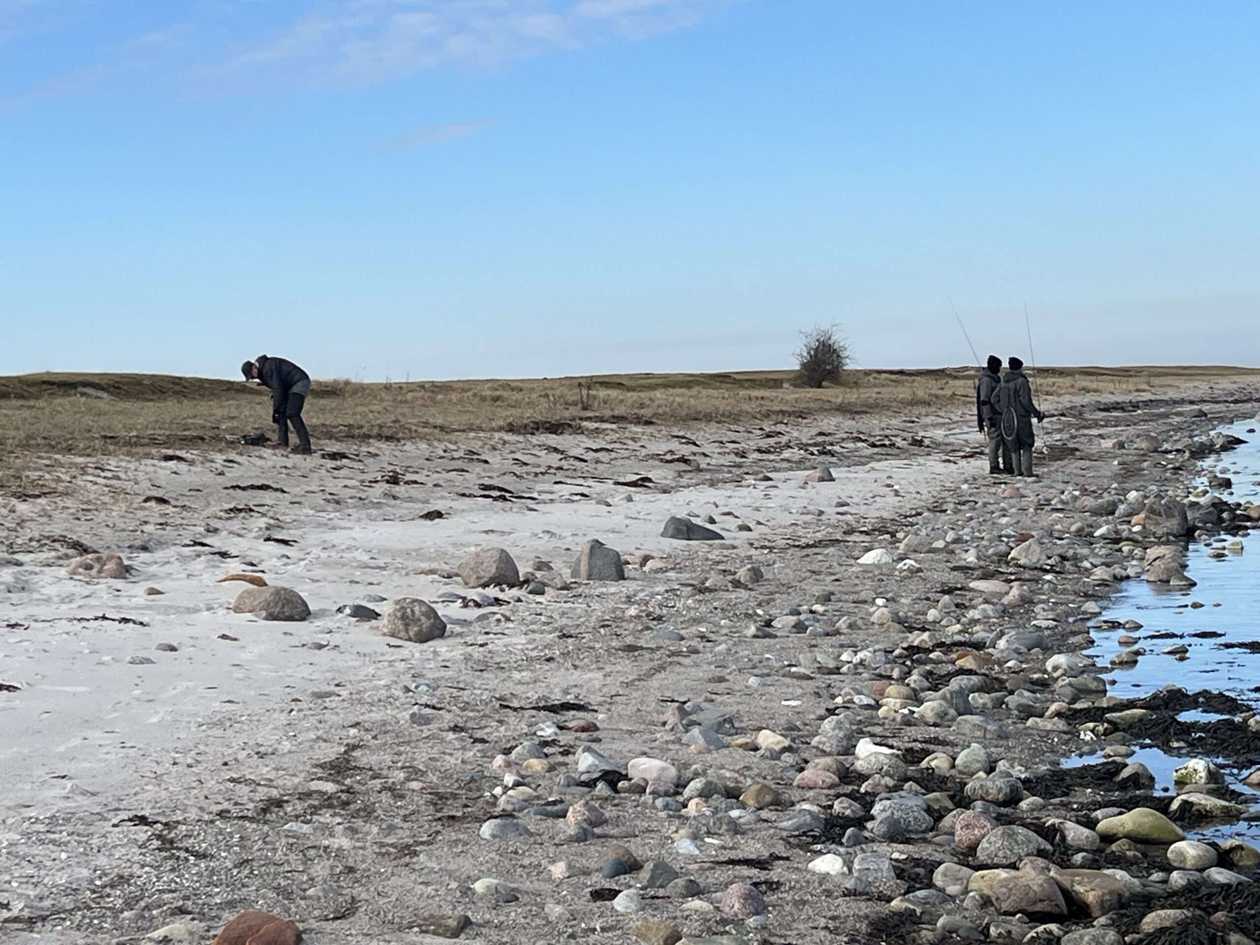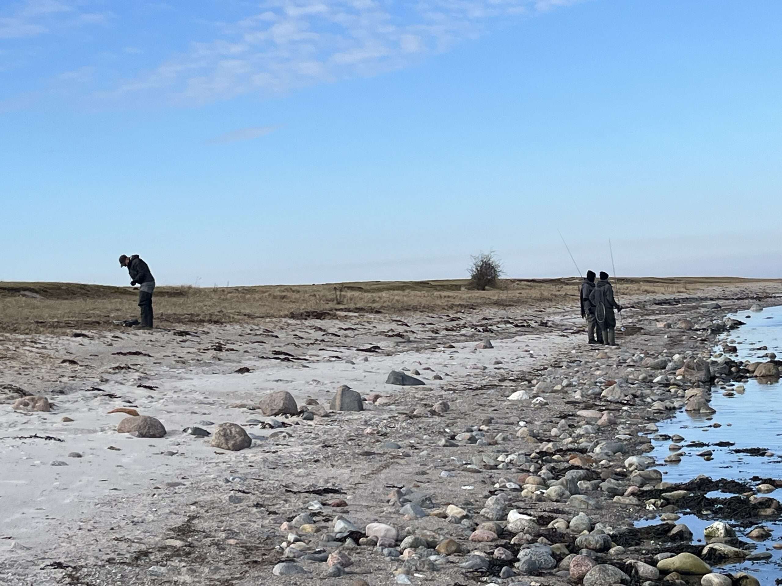 Det var et dejligt vejr, da 10 fiskere mødtes på P-pladsen ved Musholmcentret. Lejodden trak flere mand, for der fanges fisk inde i bugten. Ud mod Stigbjerg fanges også fisk, for Gert kom tilbage til vores samlingssted ved Musholms badebro med en havørred på ca 42 cm. Der var en del kontakter med havørrederne, men mere blev det ikke til , men jeg mener Per og Jan havde fisk på land. De blev udsat igen. Selvom vandet er koldt ( ca 2-3 grader) var der livlig aktivitet for flere havde følgere med ind. Der mangler bare det sidste bid, så fisken kunne landes. Da klokken nærmede sig 11,30 begyndte folkene at komme, for det blev kage og frokosttid. Herefter var der opbrud. Flere kørte hjemad, men Gert, Søren og Jan var ikke færdige med at fiske. De fortsatte en rum tid endnu, men de fangede ikke noget. Det var dejligt, at få snøren i vandet igen efter den lange pause hen over julen.