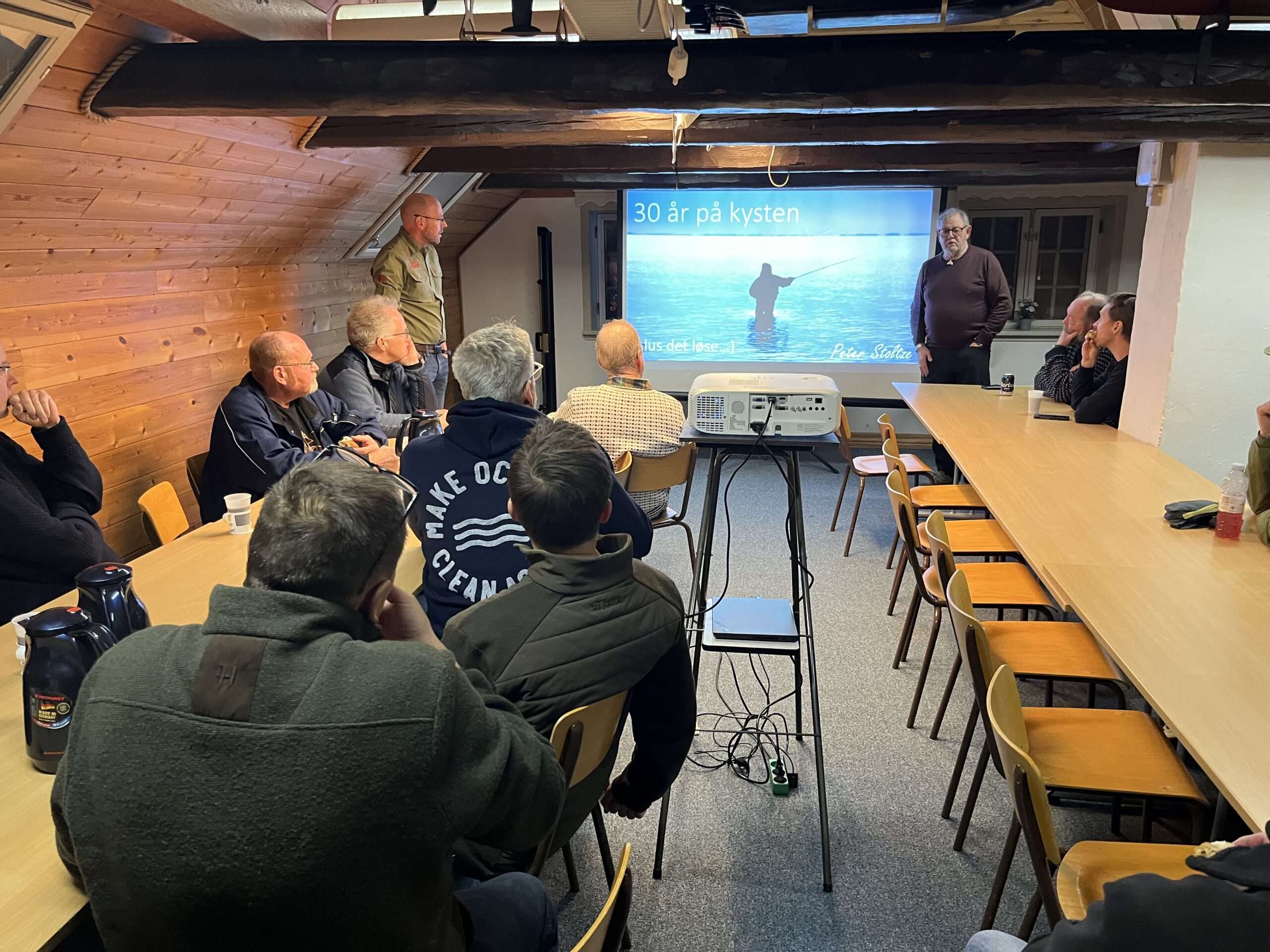 Peter fortalte om sine mere end 30 år som lystfisker. Han begyndte med at præsentere sig selv og så fortalte ah levende om sine erfaringer med fluen på kysten. Han kom omkring næsten hele paletten med fluefiskeriet. Det handlende om valg af fiskepladser, hvilken årstid det er, hvordan grejet skulle sammensættes, hvilke fluer der der duer på hvilken årstid.